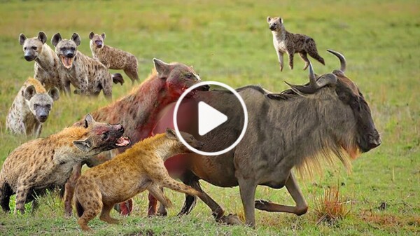 2. The wildebeest’s heart races as it senses the impending danger, and it begins to sprint, its hooves pounding against the dry earth. The hyenas, agile and coordinated, pursue with a ferocity that is both terrifying and awe-inspiring. They dart in and out, attempting to flank the wildebeest, using their numbers to their advantage. Each time the wildebeest makes a desperate leap to evade them, the hyenas respond with a chorus of yelps and growls, their excitement palpable. The struggle is not just a fight for food; it is a raw display of instinct, survival, and the harsh realities of life on the savanna.