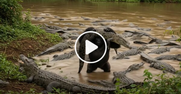 As the gorilla shifts its weight, the river ripples around it, and the crocodile, sensing the movement, begins to inch closer, its eyes barely breaking the surface. The gorilla, undeterred, lets out a deep, resonant call that echoes through the jungle, a display of strength and dominance. This vocalization serves not only as a warning to the crocodile but also as a rallying cry to any nearby allies. The gorilla’s powerful arms flex, showcasing its impressive musculature, while its stance remains firm and unwavering. The scene is a testament to the raw power and instinctual behavior of these two apex predators, each representing the untamed spirit of the wild.
